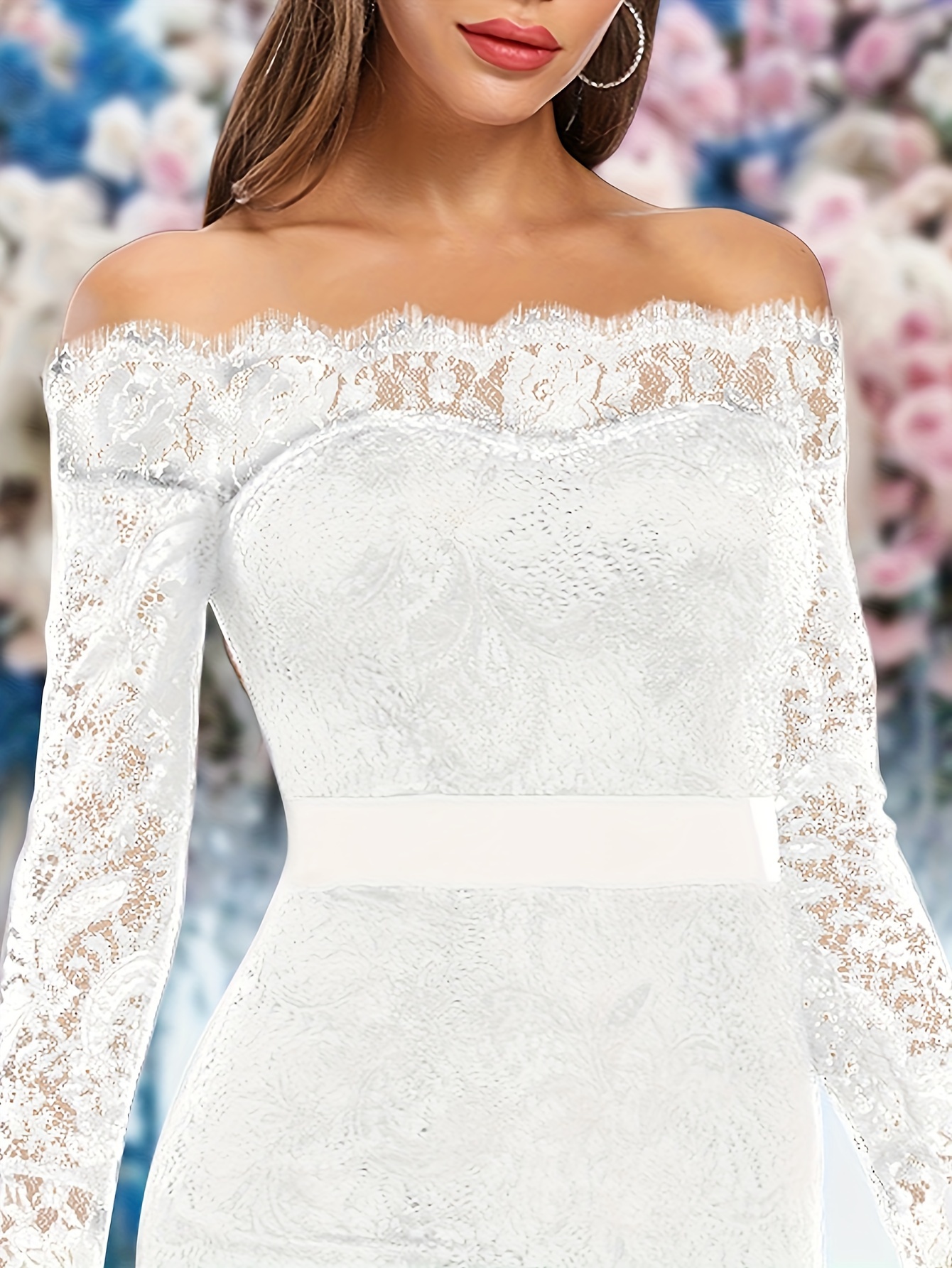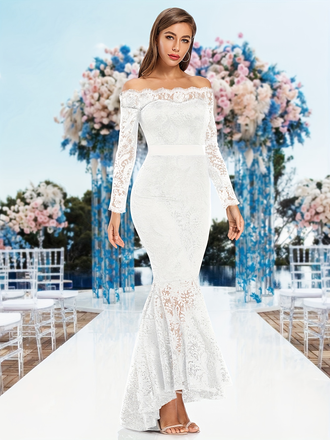 Elegant Off-Shoulder Lace Mermaid Dress for Women - Long Sleeve, Bodycon Fit with Fish Tail Hem, Perfect for Parties & Bridesmaids