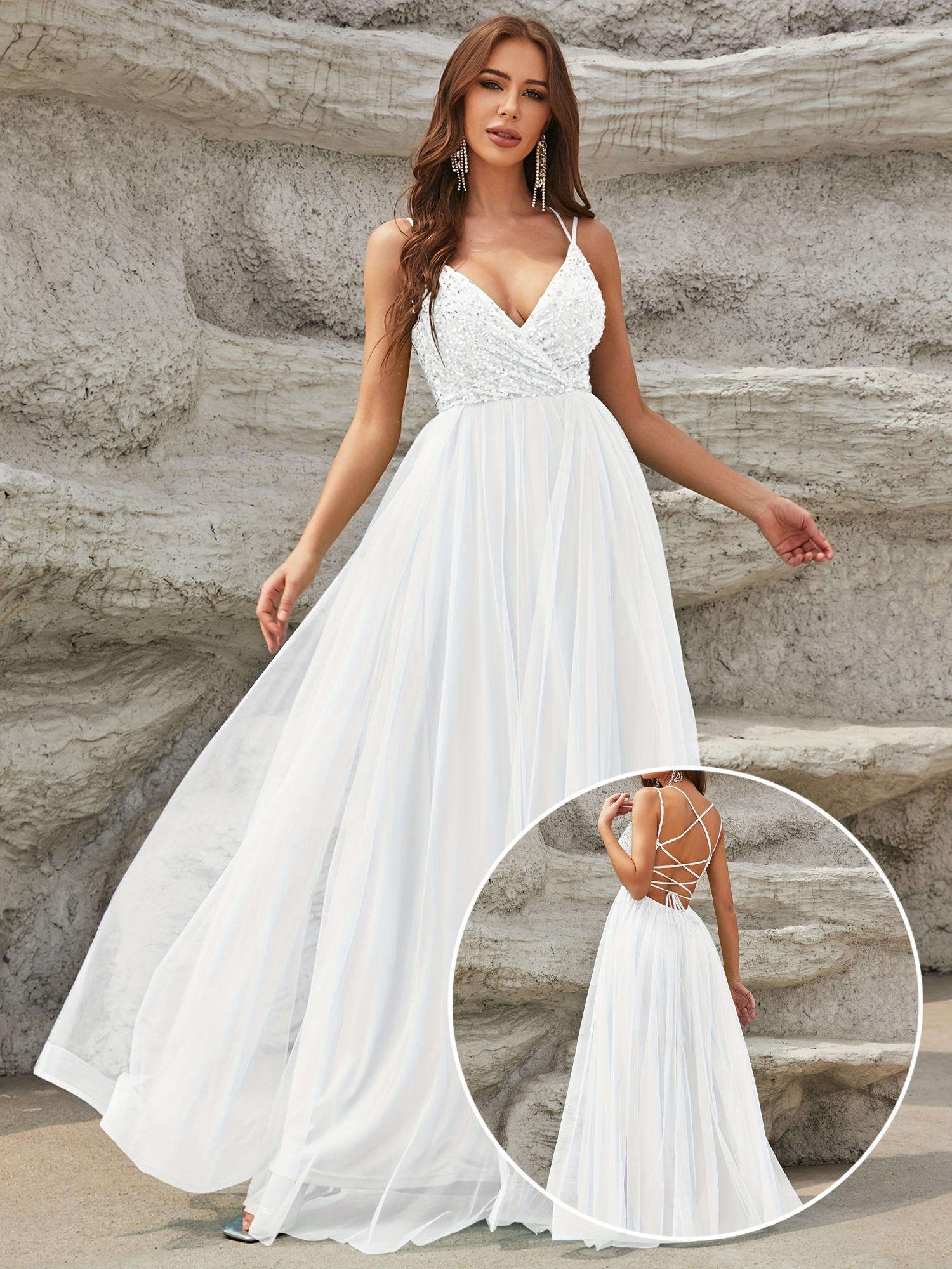 Elegant Sequined Mesh Big Swing Sleeveless Bridesmaid Dress, V-Neck Splicing Wedding Party Dress for Women