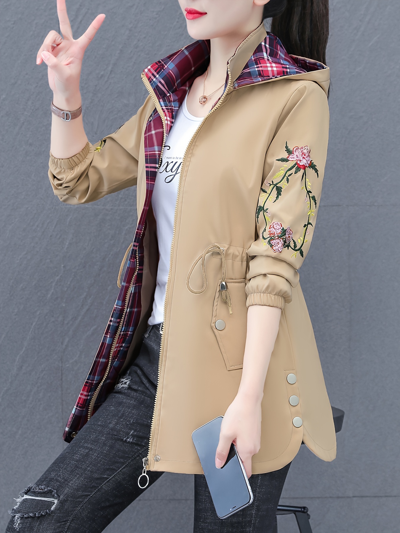 Plus Size Women's Floral Pattern Jacket - Casual Hooded Long Sleeve Outerwear with Zipper Front and Relaxed Fit