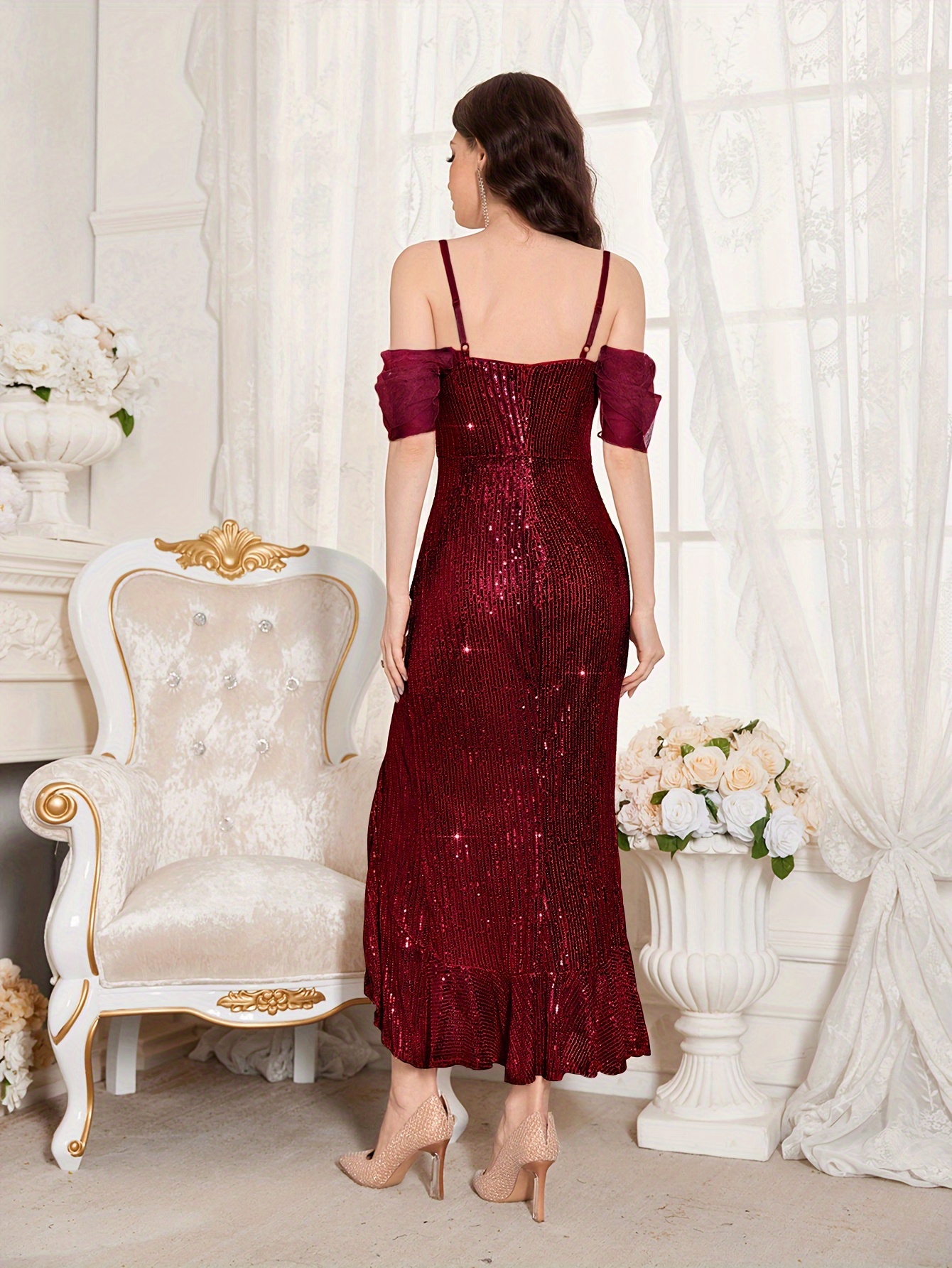 Stunning Sequined Fitted V-Neck Dress - Glamorous Ruffle Trim, Split Hem, Mid-Elastic Polyester Fabric, Elegant Solid Color Design for Wedding, Engagement, Party, and Banquet Occasions