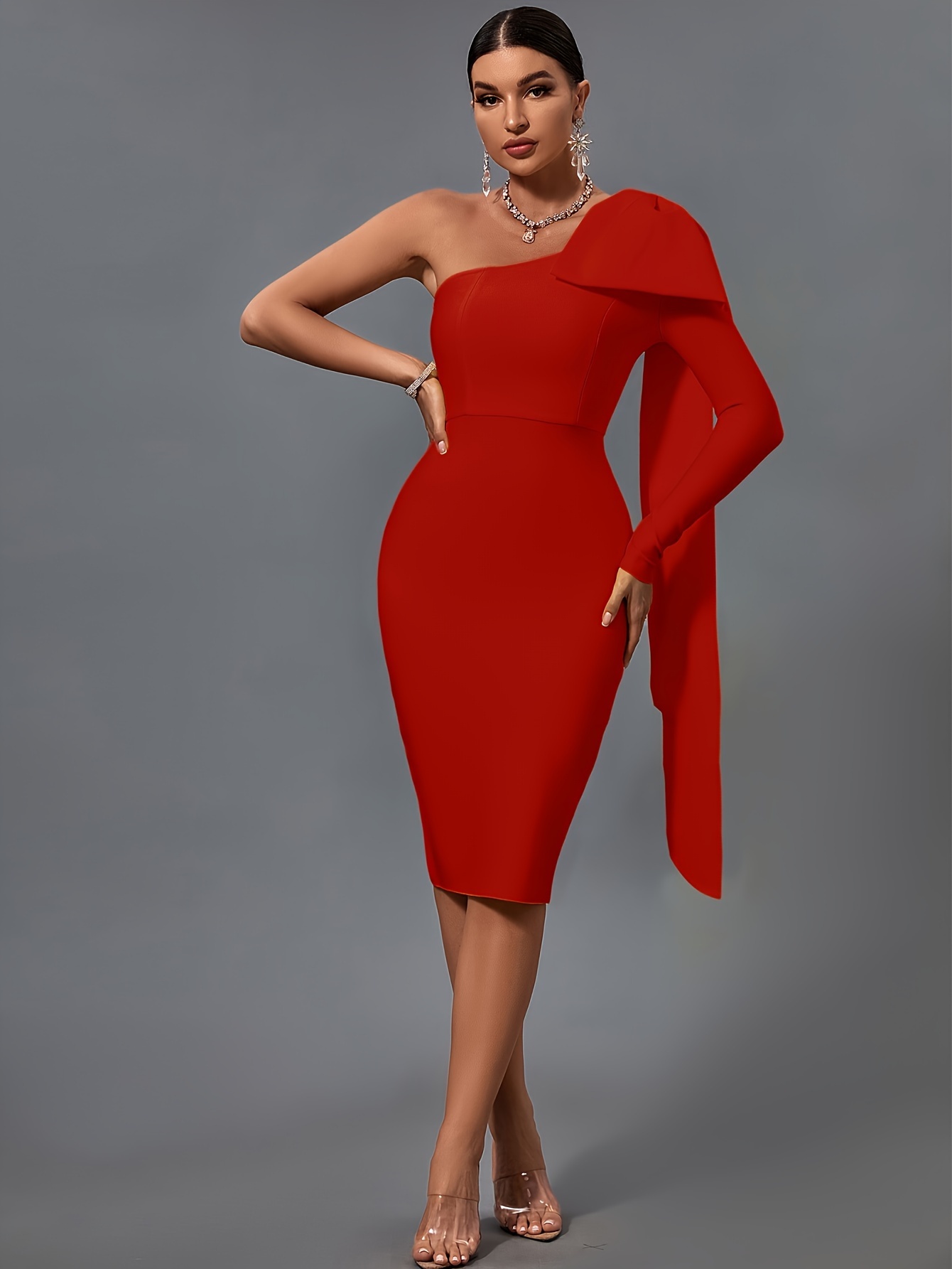 Women's Fashion Sexy Temperament Elegant Tight One Shoulder Long Sleeve Mid-Length Bandage Dress Party Cocktail Evening Dress