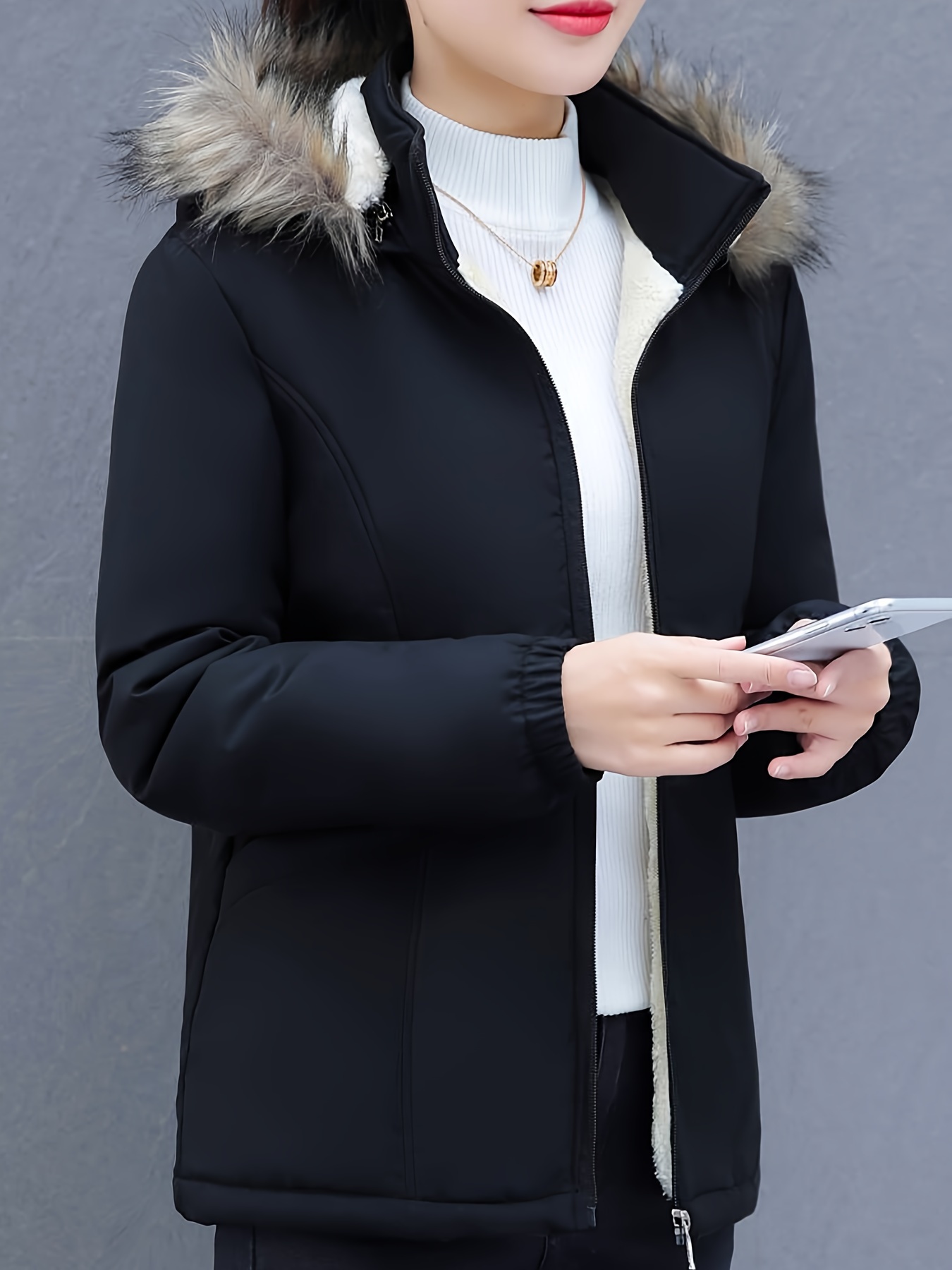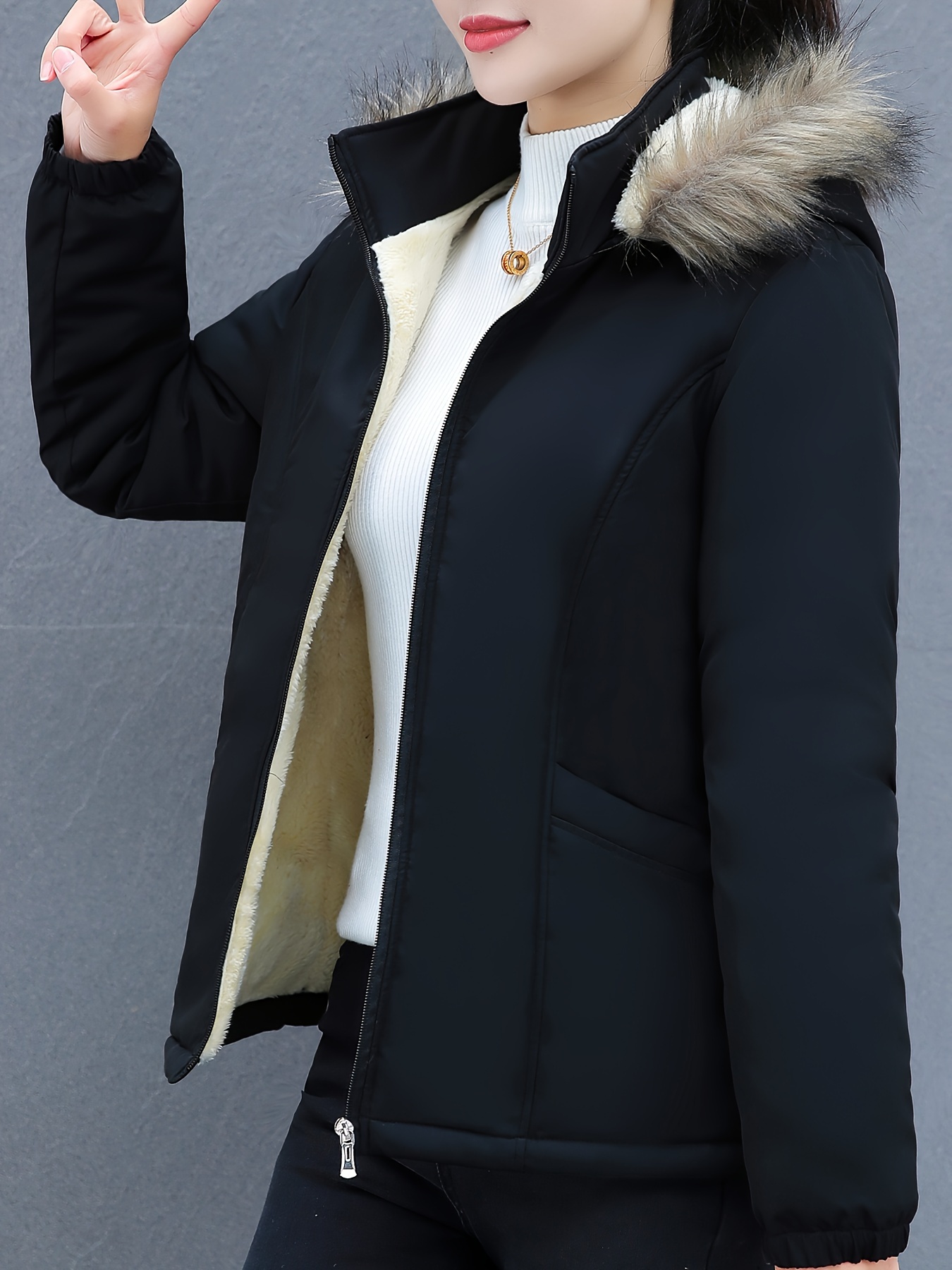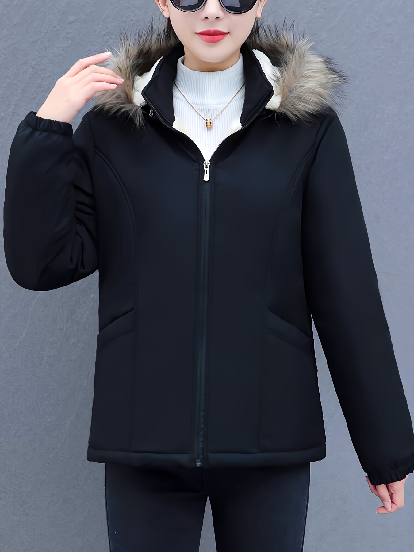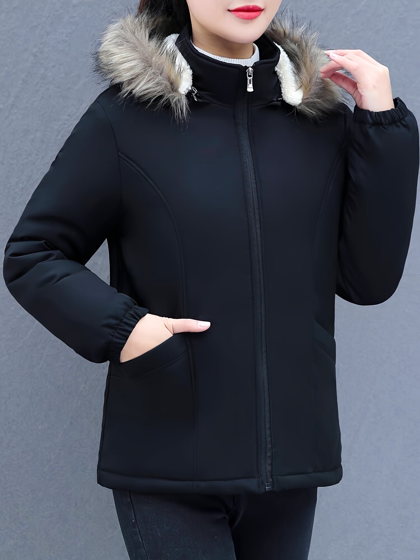 Women's Short Sleeve Winter Coat , Faux Fur Hooded Jacket, Casual Polyester Pullover, Solid Color, Regular Fit, Long Sleeve, No Belt, Zipper Front, Winter Fashion
