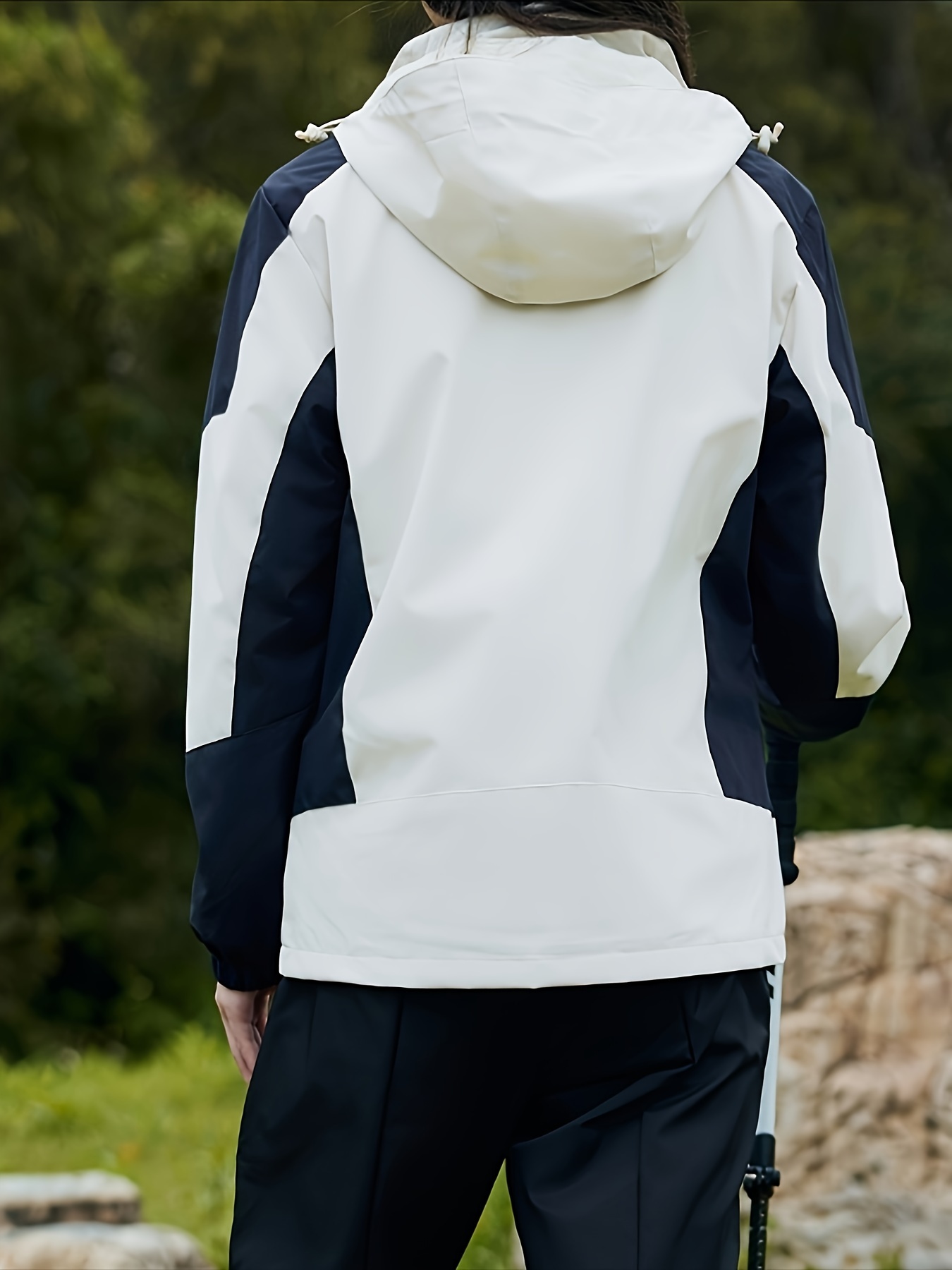 Plus Size Women's Fashion Hooded Jacket - Stylish Color Block Design, Long Sleeve with Adjustable Drawstring Waist, Water-Resistant and Breathable Fabric for Outdoor Enthusiasts, Perfect for Fall and Winter Activities
