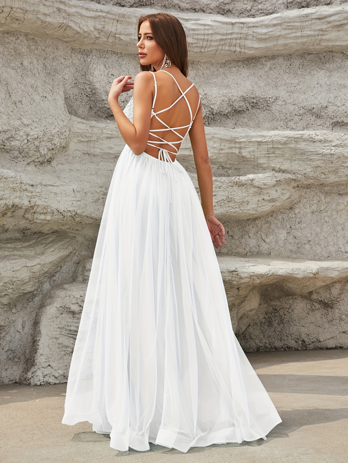 Elegant Sequined Mesh Big Swing Sleeveless Bridesmaid Dress, V-Neck Splicing Wedding Party Dress for Women