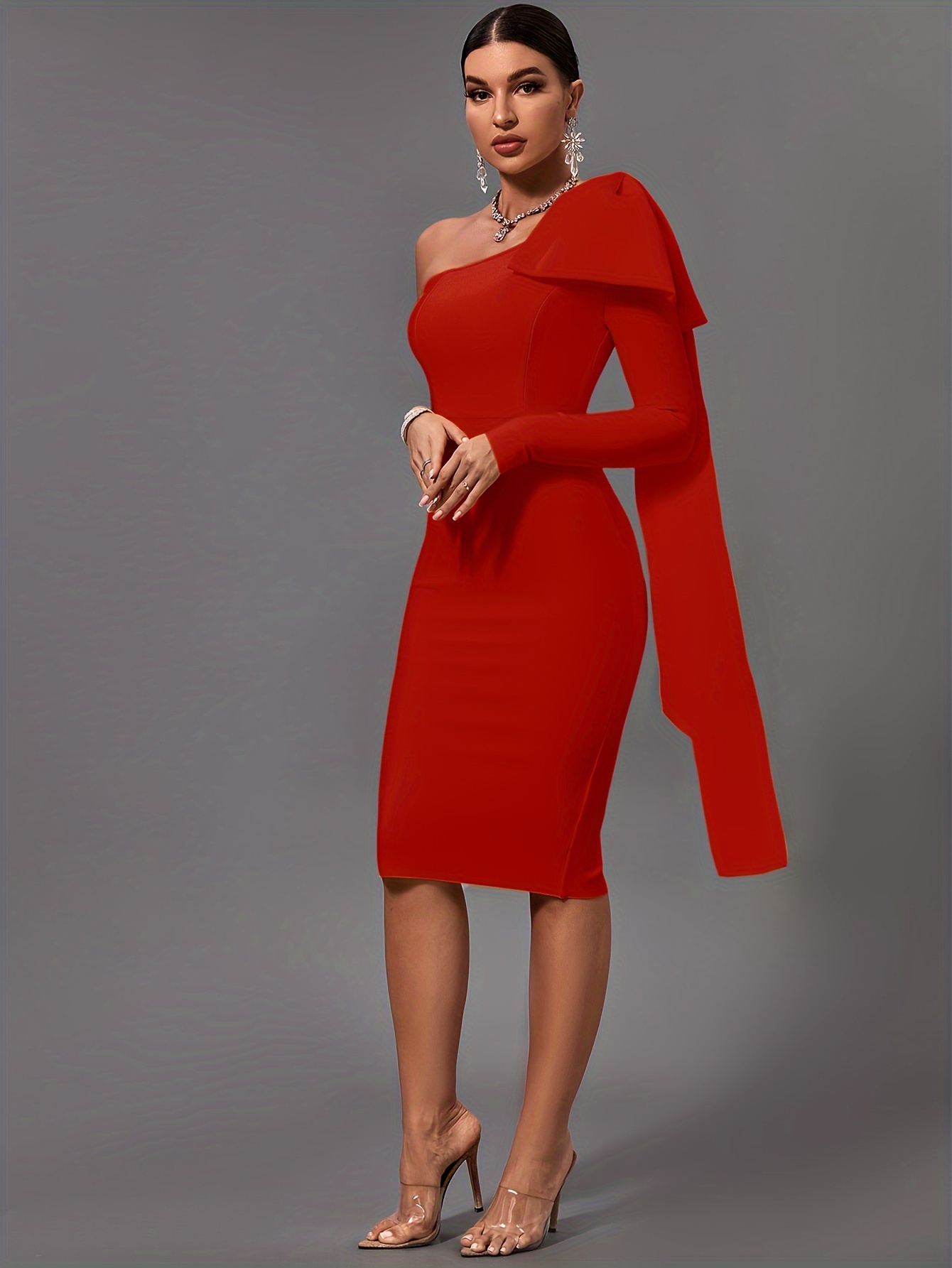 Women's Fashion Sexy Temperament Elegant Tight One Shoulder Long Sleeve Mid-Length Bandage Dress Party Cocktail Evening Dress